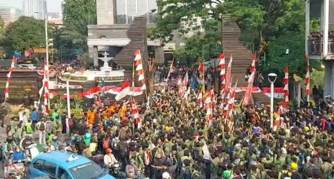 Sejumlah aliansi mahasiswa mulai memadati kawasan depan Markas Polda Metro Jaya, Jumat (29/8/2025). Massa aksi datang dengan melakukan long march…